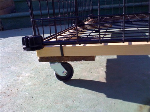 The original cage had wheels but it was attached to the cubes itself which wasnt much sturdy. So this time, we screwed it into the wood frame.