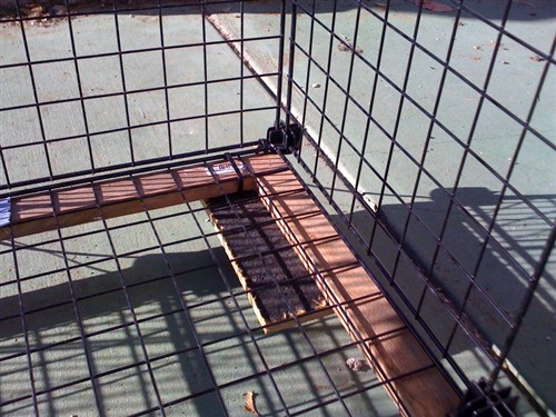 I thought about supporting the middle part also and making it more rigid. But I’m thinking as the buns jump up and down, I want the cage bottom to flex with them. Because the cage is elevated, the original cage made lots noise when my buns jumped up and down. I tested the sturdy-ness of this new cage by putting my 200 lbs hubby in it. He looked like an overgrown evil bunny from a horror movie.