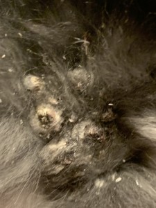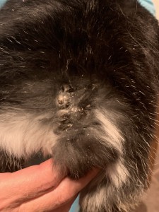 In a few words, can you explain the symptoms? He has hard, thick scabbing at the base of his tail (location where it was first noticed), and has since expanded up his spine from tail area. Mostly centered around back quarters, not present on his front half. Scabs are accompanied with dandruff, flaky skin. Rabbit scratches/grooms at it. My mom describes it as ‘cement’ – like you can pick and tug at it but it doesn’t budge. The vet doesn’t want to attempt to remove it because it runs so deep, it would create a large open wound.
