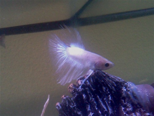 Banana is Peach bodied with Blue/Cellophane fins Crowntail