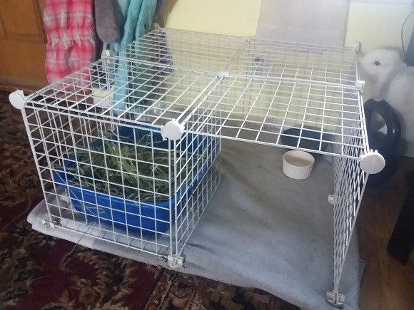 My six month old (human child) recently started to crawl and I discovered I need a creative solution to keep him out of a litter box   I have the main litter box/food area set up so it’s basically a maze and that keeps him out of there (pictured below).  This won’t work for the other litter box though because it is in front of the closet door in the living room.  The litter box needs to be small and just slide out of the way when the door is open so we can get our coats.  I’ve tried moving the litter box but Moonpaw will still go to the bathroom there anyway.  So I need some way to have a small, easily moveable litter box that a bunny can get into but a baby won’t notice/can’t get into.  It’s asking for a lot!