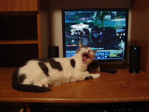 I was playing WOW and my kitty fell asleep in front of my monitor.  I was just about to take a picture and she yawned really big.  I really need a caption for this and I know you guys are so good at it!!