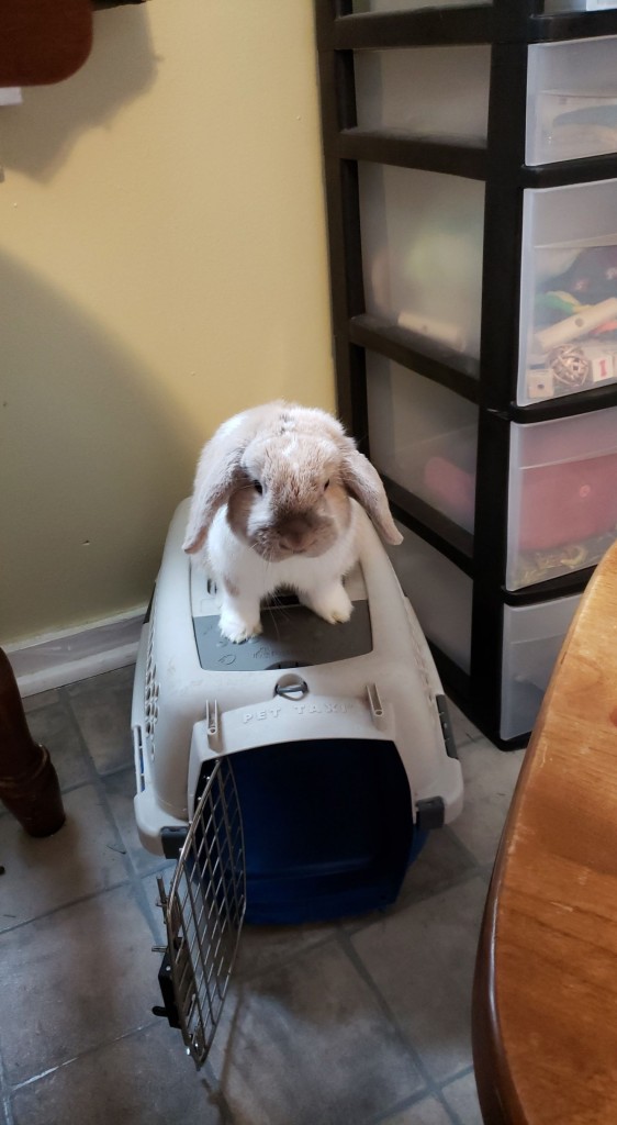 This was Gus the night before, clearly stating he was not a fan of going inside the carrier. He did however use it as a chair when we were eating at the table and was able to be snuck a few pieces of celery.