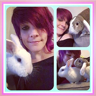 And a pic of the 2 of them with me – they aren’t cuddle bunnies but they’re pretty awesome! Mt binks (white rex) is so playful and sweet, and o’s been such a joy to watch Mrs Binks become friendlier over the time we’ve had her – she used to be v timid and hated being touched. Both are rescue bunnies