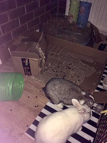 ! Another issue is that I’ve had to close their mini hutch as MrsB keeps peeing in there, I had to throw away their warm carpet and material items as she urinates on anything warm/cosy – so I’ve put down cardboard as I worry they’ll get cold in the conservatory at night. I’ve followed all the advice I have read online, and it seems that this is usually only normal for un-neutered rabbits.