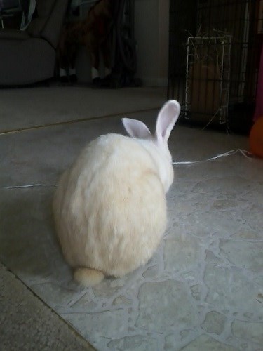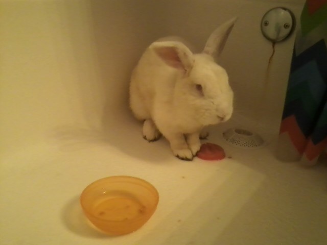 For a few days before his neuter we had noticed a huge white bunny at the end of our street in someone’s yard but no one could catch him. We ended up knocking on the door to ask the house owners about it and it turns out that bunny was their’s and he lived in their yard with no cage for years until recently when he started digging out. They asked me if I wanted him and of course I said yes so he didn’t get killed by the big dogs next door to them. After 10 minutes we caught him and I was holding a flea infested, dirty New Zealand White bunny. He’s so much bigger than Watson is! He would not eat or drink anything and I was very worried about him. After a few rounds of fluids he started to perk up and wanted food slowly. I swear he still has his winter coat too, his fur is so thick. The owners were very happy that I wanted him because they didn’t know what to do with him. He wouldn’t have made it out there this week with our 95+ degree temps. He still doesn’t have a name, and he’s pretty gross, but someday he will be white again.
