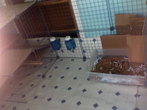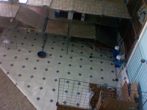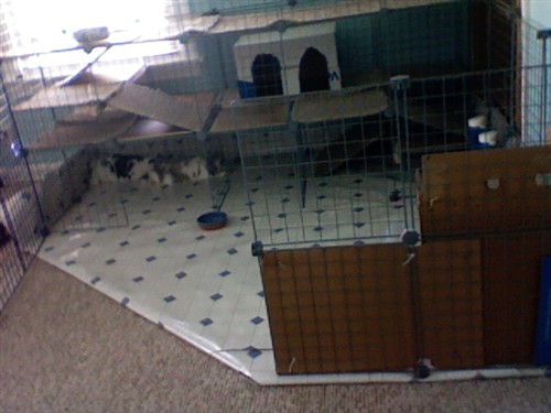 As you know from my previous posting, I’ve been having pee troubles with mainly Gracie (I think). So I took some advice and changed their cage setup. Actually we removed the lino. flooring and bought the same design at Home Depot. When we took up the flooring (with the puzzle mats underneath), there had been a whole in it that we had covered with tile. Well when we took the floor up, there was a big wet spot on the mats and also where they had been peeing in the corner! We’re thinking they kept smelling it and remarking it. So we cleaned it up, turned all the mats over and put new flooring down! We’re crossing our fingers that this was the solution and a new floor was what they needed! We redid their cage a little bit, keeping the concept of having 3 floors with ramps. Moved their litter box and put their hay rack down a little more. We didn’t cut around the edges of the floor and put it up around the wall as a splash guard and also to keep all the hay in. Everything was sprayed down with vinegar water, vaccuumed up and is all clean now. They love going up the ramps and crotching down under them. So happy they like it! I hope it stays this clean (yeah right!) and there is no more pee issues! If there is, then the next step is maybe to take them to the vet….I dunno. But I’m hoping this solves it!
