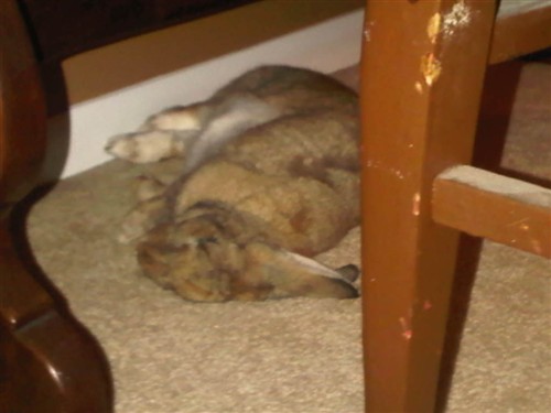 Eddie scared the crap out of me when he first flopped. He was sitting there one second, I looked away, looked back and he was on his side NOT MOVING! I ran over and started feeling him cause I thought he was dead or was sick or something. He pops up and gives me a “leave me alone” look and hopped off. LOL I had no clue they did that. I got a crash course in rabbit behavior like the first 3 days I had him. hehe