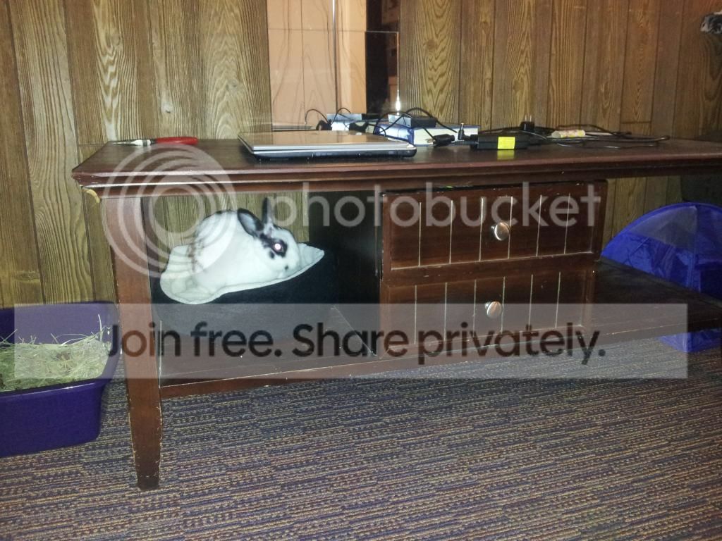 Here is a very small portion of my buns free roam area (His ‘outside’ litterbox, his bed on the coffee table (with him in it! I think he likes it there because its similar to a hidey house) and his cat tent on the far right side (the blue thing)