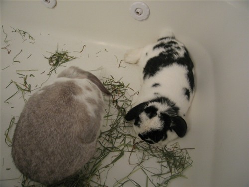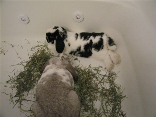 Poor Hannah. Then they spent the rest of the session flopping a million times. I’ve never seen so many bunny flops. Sometimes they were full on side flops, sometimes just back feet out. Sometimes they were parallel, sometimes not, but always a few inches away from each other – never at opposite ends of the tub.