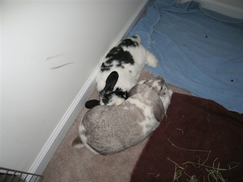 The bunnies sat together, ate together, and groomed themselves for at least 20 minutes.There was some frantic humping from Hannah towards the end. Otto did not like the humping and scrambled away as fast as he could (with a thump thrown in for good measure.