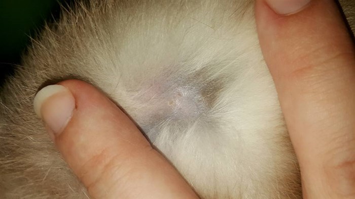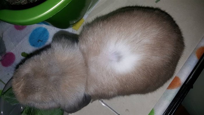 Hi there. I have a 14 week old female Holland Lop named Milly. I just noticed this evening that she has a patch of fur missing on her back. It wasn’t there yesterday, there’s no white dandruff like flakes coming off of it, and there are what looks like a couple peach colored scabs where the skin is showing, but nothing else. We did just recently enlarge her cage (which she is uneasy about and still getting used to) and tonight I was late feeding her her greens, but she had plenty of hay and water. She did seem a bit anxious when I brought her greens into her, though.