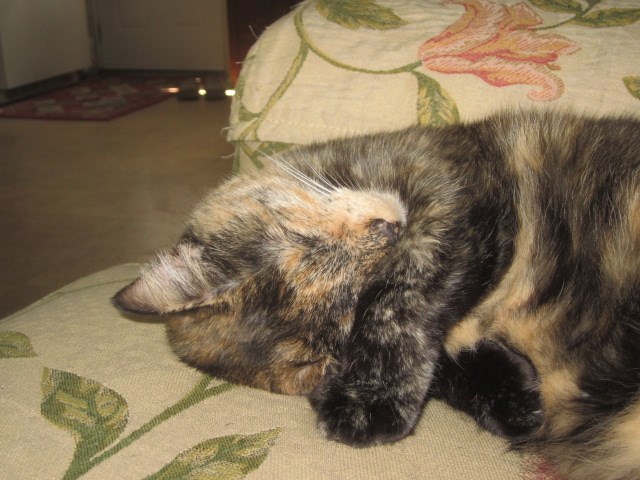 This is Emma, my Tortoiseshell cat, She is 4 years old now, we rescued her when she was only 6 weeks, it was a long road to get her healthy, these days you would never know. She is spoiled rotten , healthy and … a little on the chubby side lol. She rules the house. These pictures aren’t the best but they are SO cute IMO.