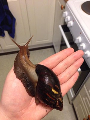 And, last but not least, in addition to my two bunnies I have five Achatina fulica, or Giant African land snails living in my apartment. They’re slimy, and I hope no one is icked out if I show a few pictures of them? I think they’re absolutely fascinating to watch, and really cute as well. Nobody seems to get me when it comes to my snails, but oh well. I love them anyway! The biggest one is around 13cm shell length – pictured below on my hand is one of the medium-sized ones, with a shell length of around 10cm.