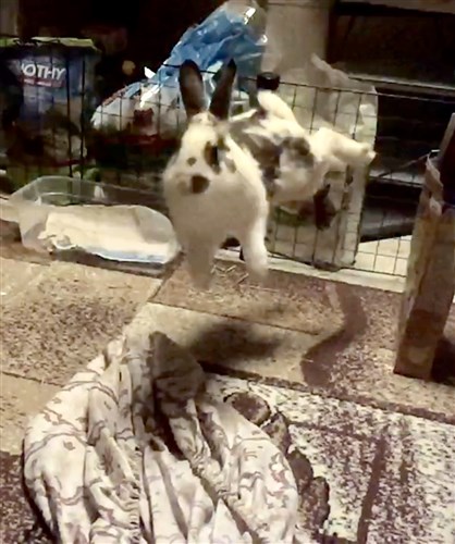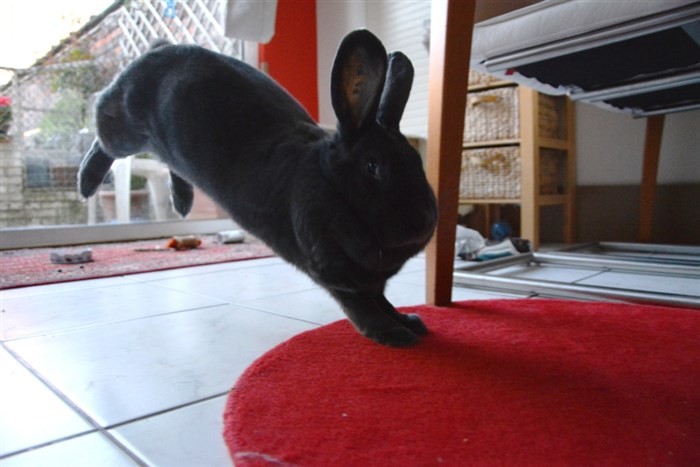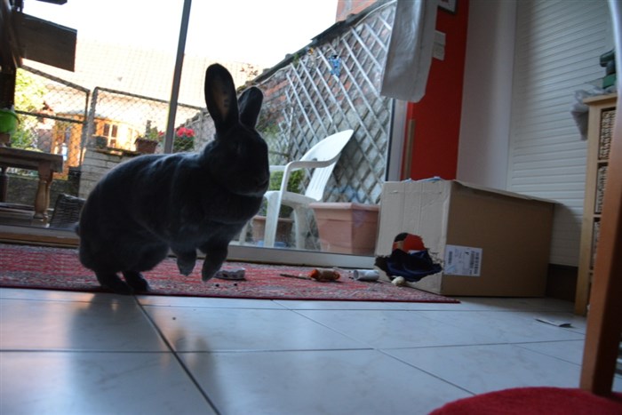 She has become a bit bonkers these last few days and flies between her two ‘safe’ rugs (tiles are slippery!) like an excited kangaroo!! And then she’s SO happy and tired, that she does MEGA dead-bunny flops almost rolling 360°, just like a fighting crocodile!