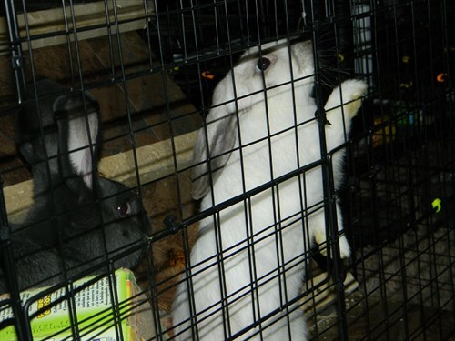 The black one I saved on Valentines day so I named him Vinny. The owners had left him in the parking lot in a tiny cage without food or water so I took him in. The white one was my first, his name is Bunsie.