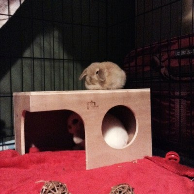 So, yeah, they’re doing great! Very inquisitive little buns, still somewhat skittish but who can blame them! They already wait at the door of their cage, begging to be let out so they can play. Currently I’m sitting with them in their fenced-in play while they binky, romp around, and nudge my feet. Oh, and poop. There’s LOTS of pooping going on