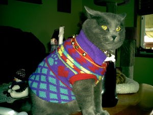 I love the look on his (her?) face. It’s like “Yep, just wait till you go to bed tonight… You’ll be eating this sweater, human!!”