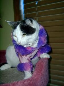 I got all my kitties used to wearing clothes when they were kittens so they put up with and tolerate my dressing them up. The trouble is that I usually have to buy doggie clothes because cat clothes are practically non existant.
