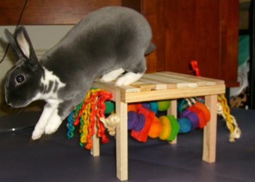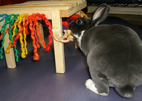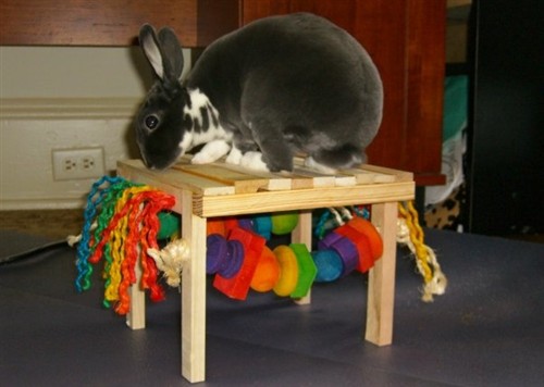 Anyway, it arrived about two weeks ago and he is still thrilled with it. Hops on. Hops off. Chins the sisal. Chews the sisal. Chews the wooden chewies. Crawls underneath it. Hops around it. Chews on the top part. Hops on. Hops off. Chins the sisal….