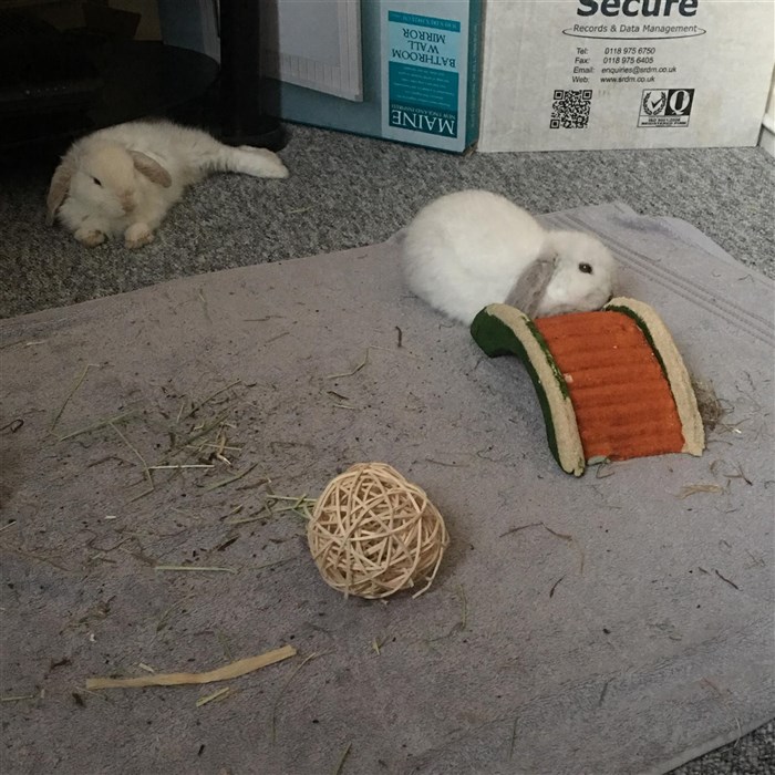 For the first three days we did our very best to never hold the bunnies. We wouldn’t pick them up or touch them, only sit on the floor with vegetables in hands. Both ate from our hands, which we were very pleased about. And swiftly, one boy (Strawberry) was very happy to let us stroke him. We were overjoyed! Now he loves a pet and even demands grooming with his head down and loafing and doesn’t even freak out if we need to pick him up – such as vet trips!