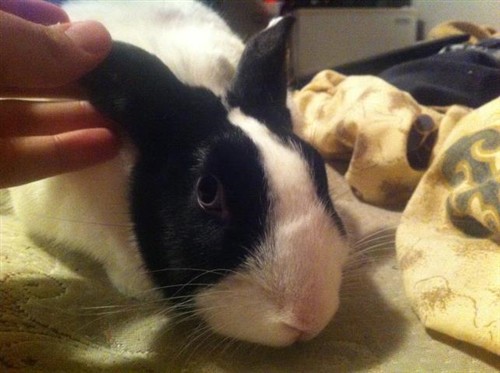 She is a black and white rabbit, she has bright blue eyes, her ears are about 3 inches long, she probably weighs around 5 pounds and is quite long when she stretches out.  This is what she looks like!