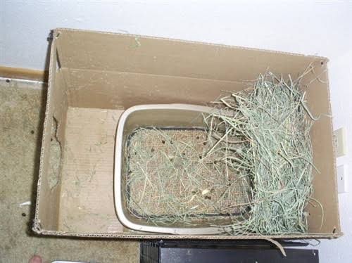 Yes, she has hay outside of the litter box – she has a feeder in her cage, so there’s at least five feet between where she eats and where she defecates. And I’ve been using shredded paper with a bit of hay on top as litter.