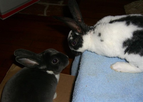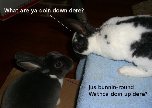 Yesterday we had company over, and I found the two buns hiding behind the couch together. When the company left, they spent the rest of the evening zooming around the living room. Weeeeeee!