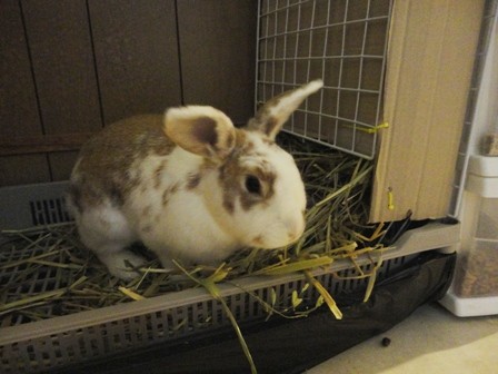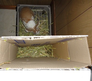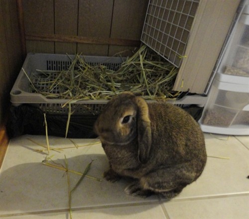 Below: Rumball eating hay outside the litterbox which my hayrack design was suppose to prevent