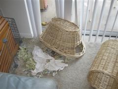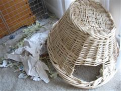 Today is my day off, so first I let her into the forbidden zone, aka my bedroom. After a while she came out and went into her basket for a nap. I heard noises while on line here, and she had moved her basket (she is under it, then butts it with her head and drags with her teeth) to a better view of outside. Here’s the pix of her new arrangement. Sometimes I take away some of the shredded paper to give her more to work on. LOL