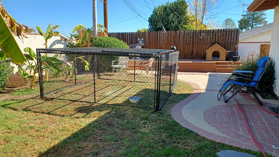 Hey everyone found this rabbit where I live roaming around my yard, zoomed in on it the first time i saw it since it didn’t want to scare it. I live in coyote, hawk, snake, etc area, so I didn’t want it to die. It would come up to me but wouldnt really let me pet it at first, but I could touch it with a few fingers before it moved a few inches away. Pretty large rabbit, black spot on it’s eye. Im 100 percent this was a pet. He/she(think its a he since it doesn’t have a fat chin/dewlap) did get attacked by something and has some damage( looks like a scratch) on his back, but no real issues from it, walking fine, eating, drinking, not touching it. Finally caught it and for the last week been trying to find its owner and no luck. Im starting to think someone dumped it as I live near mountains. So i bought a large hutch(waiting in the mail for it ill post a link below), I live in Southern CA and it doesn’t get too cold, heat is more my issue, and am trying to learn to care for it.  Right now the rabbit is inside in it’s cage in an area the dogs can’t get to it. I think it’s a Rex rabbit, but im not sure, I hope someone here could tell me. I would appreciate the help on what type it is and any small tips beyond the basics. Little guy is gonna have to live in this cage sadly until I get the hutch on the November 3rd as I have 3 large dogs, Siberian husky, German Shepherd, and a Cane Corso x Rottweiler mix. I had a cat in the mix before, it would try to even feed off my Husky, so im sure i could get it to work out lol. I have a fenced area to let him out to roam so he can get some exercise a few hours a day without my dogs bugging him(even though it loves my dogs and tries running at them lol) before the hutch gets here, but i still feel bad, better then dying though. Thanks for any help