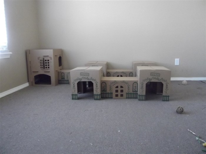 – Louie spends a lot of time in his cardboard bungalow, which is a cardboard box turned upside down with a door cut through it. Cardboard boxes that 24-packs of bottled beer come in are great for this. Just rip off the top lid panels and cut out a door!