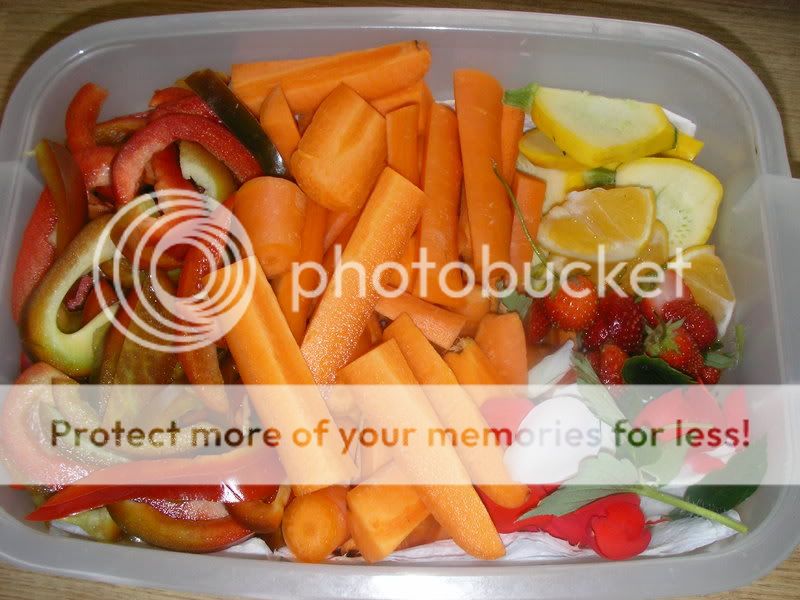 Capsicum, carrot, (these are treats only in tiny little quantities! –>) summer squash, orange, home grown strawberries, strawberry leaves, rose petals and rose leaves.
