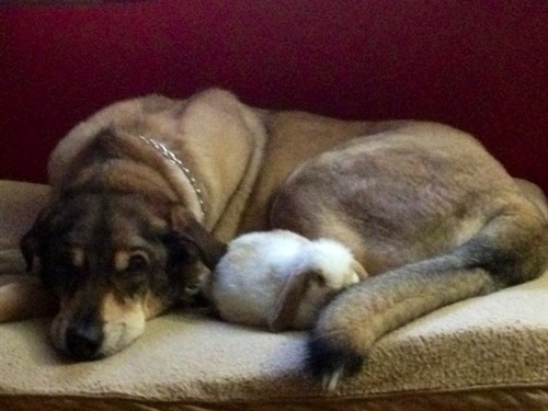 This is Bear and one of my past bunny’s taking a nap together.