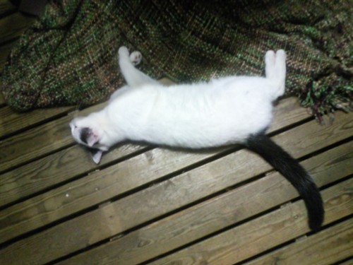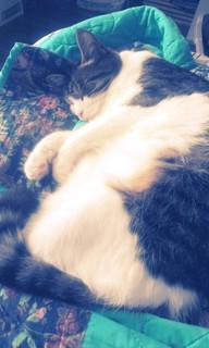 My oldest kitty Koda. All of my cats are indoor/outdoor. He prefers outdoors unless it is raining. This is his favorite thing to do sleep. He is not super cuddly but will tolerate you petting him. If he is scared he will plant himself on your lap and not move.