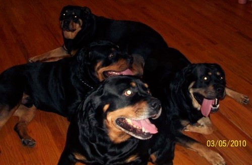 Figure I will just post this picture and get them all out. The rottie in the back is Pandora, we decided to breed her with the rottie in the very front (The one with the gray around the mouth) His name is Felonious. The result is the two rotties in the middle. The one on the left is Thunder and the one on the left with the dumb look and toungue hanging to the side is his brother Assault. My parents only keep Pandora and Thunder, the other two live with friends of the family. Sadly Thunder’s father Felonious passed away last year.