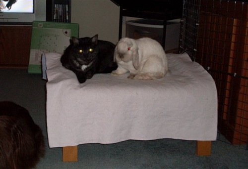Yeah, I am still working on bonding them. It has been getting better and better. It is so odd- both Cotton and Schroeder weigh within 2-4 ounces of each other with Schroeder weighing more. Everyone, myself included guessed at the vet that Cotton was the bigger bunny.