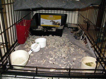 I got Henry about 2 months ago, he’s neutered and about 4 years old. He has free reign of my living room and his cage is a front opening dog crate (I’m attaching a picture). This is the cage he came with, however, the woman I got him from had it didn’t let him run free (she had 3 cats), and had made sides for it, and the whole thing was filled with carefresh. Even so, as a caged bunny he was litterbox trained, and she had a small corner pan. So now that I have him and let him run around, I’ve upgraded him to a larger square little pan and fill that with carefresh, cover the floor of the crate with newpaper and a towel. The first couple weeks I had him, he was great. Then he started kicking the litter out of his box. Annoying, but ok, its his box, his cage, it doesn’t look nice and clean but oh well. I’ve tried to figure out if he does this when its too dirty (nope, doesn it most to newly changed litter), or when there is too much, or too little…the only thing I’ve come up with is that he’s just silly. Then he started rearranging the towel in the back of the cage next to the litter pan, and he likes to push it aside and rip up the newpaper underneath. Again, its kind of annoying, but its his cage so I figure I’ll let him be. But this past week, newest development, is that while he is still using the litter pan, he is ALSO peeing and pooing in this other back corner, on the newpaper. THIS is more of a problem to me – I’d really prefer him using the litter.