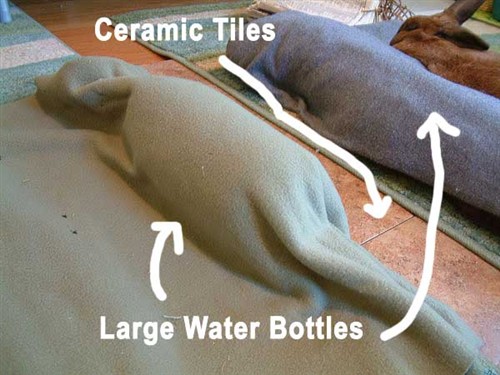 I get the extra large bottles and make little bed sides out of them. i also paired that up with large ceramic tile squares that stay cool (if you have hard wood floors, put something soft underneath the tile otherwise you can scratch the floor over time