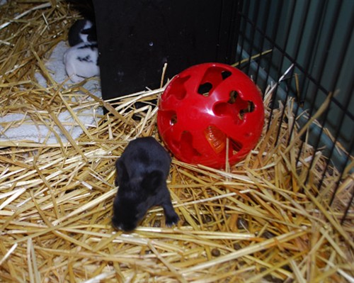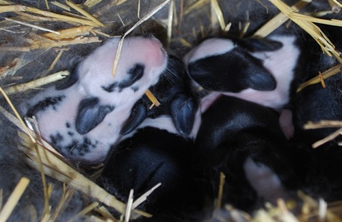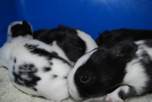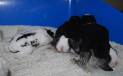 They are doing well this morning. Stu has buried them deeper inside the nest because they were jumping around a lot. 3 of them have dutch markings. 1 is all white with black ears and black spots all over, and one is all black like stu, but with a white dot on its nose.