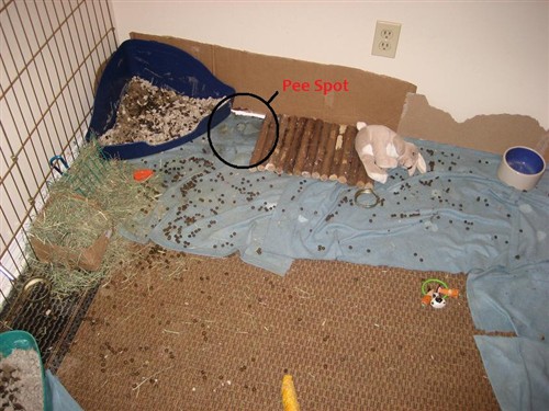 The trio has been bonded for a while now, and have been dealing with the poo wars. They had two smaller boxes, and one larger one so we bought them a new large one and took one of the smaller ones out. There are 3 litterboxes in the pen. The poo wars have not lightened at all and now they have taken to peeing all along the front edge of the litter box and it is gross, and they always do it, and I mean huge pee puddles. I have had to flip and wash the blankets that are now basically ruined. It is ridiculous the amount of poo that needs swept up EVERY morning, and I contantly have to pick up more throughout the day. The pic below is of this morning, just one corner, the rest of the cage is like this too. They do use the litterboxes but not well, and my husband is getting sick of it.