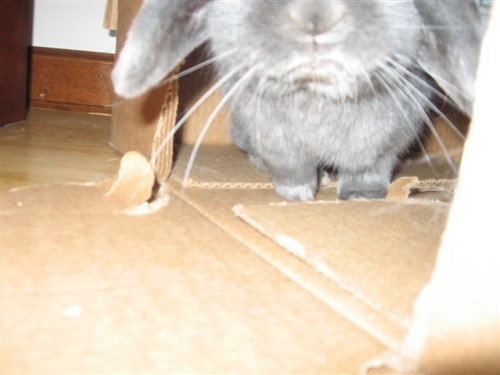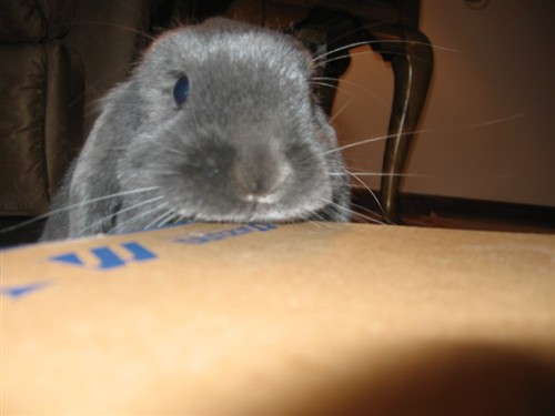 Peppy was flopped out and asleep on top of a box, like in the picture below, except the box was way too small for her and so her head was completely limp and dangling off the edge! I just about laughed my face off when I saw her…silly bunny sleeps in the weirdest positions ![]()