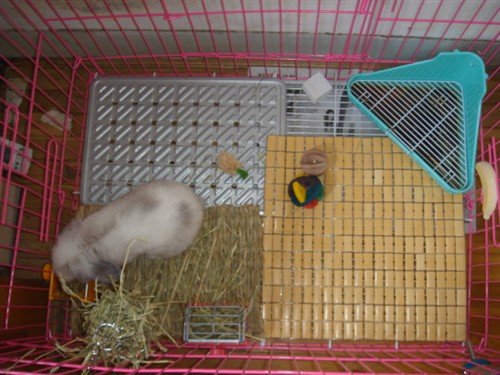 a 88cm in length * 60cm in width pen, that’s the maximum i can provide for Fluffyin my bedroom.  as compensation, he is allowed sevral hour free time daily, basically, 30min at morning, 30min at noon and from 6 p.m till i go to bed at night. at that time, he jumps up and down, runs back and forth, rubbing everything with his chin, indicating “that’s mine!” and flopping in the midle of the ground.