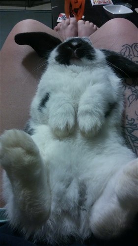 Never seen a bun who likes to just lounge on their back! but he does! He looks black and white but he is really gray and white!