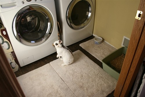 So here’s Rhinelander’s area. He has the laundry room and free run of the downstairs during the day. Right now it is lined with my 100% cotton rugs since he still won’t touch my floor. Then I have an old sheet folded up long and skinny so he can run to the living room and back. I’m going to be getting an old area rug from my mom tomorrow and will cut it in half. That way I can get my rugs back! lol