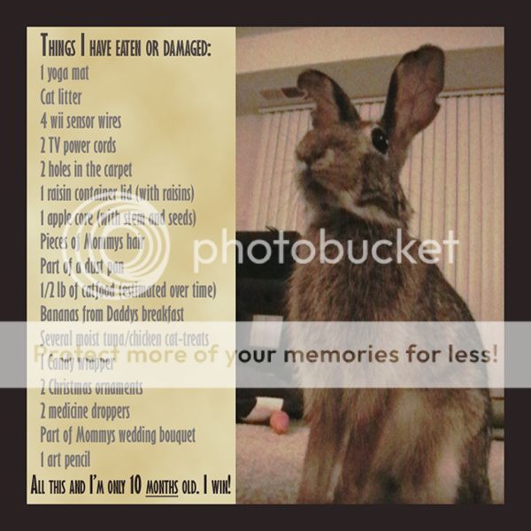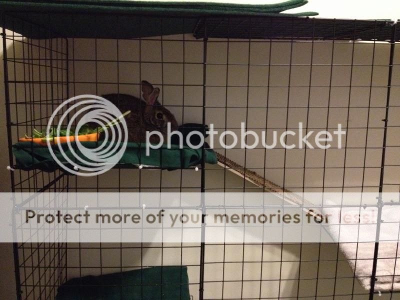 BM- You have my sympathies! The hubby and I really want to get into a house from here, but have been looking at apartments in case it stretches out too long or our new budget doesn’t allow for it (which it should… but initial costs are fun; as I’m sure you know!) I just managed to aquire a section of another room to use as a secondary space for buns and Zoey when I’m cleaning the room we’re all in. Tilly loves it, Zoey couldn’t care either way as long as someone is with her, and Pete soully DOES NOT APPROVE. lol He was so angry about being taken away from his stuff that he decided to be a little mexican jumping bean, so he got to stay in his carrier while Tilly and Zoey got to explore the newly barricaded area.