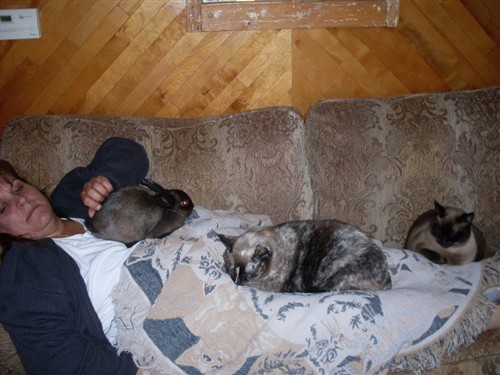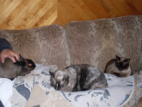 My mom’s been home sick for the last week (she has an absess on her tonsle) and anyways at least one my kitties have been beside her ever minute of everyday, i came home from school ckecked on the buns and brought hershey in to play.  Both of my cats were sitting on my mom when i came in, i’ve actually never seen them so close without fighting before so i set hershey on the ground and ran upstairs to grab my cam and when i came down this is what i saw: