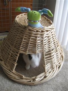 We tried a new toy for Spencer and set up a big basket filled with shredded brown shipping paper.  He loved it but it became a litter box.  Looked in it today and found tons of pee and poop.  Oh well … it was a good idea, but not for this bunny.  Any suggestions?  Should we try stuffing the basket with towels for him to play with?  He’ll probably always consider it a litter box though …