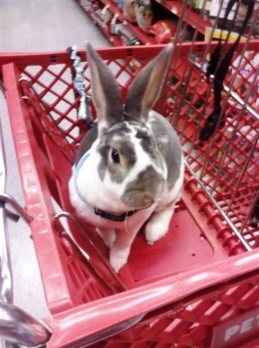Aw! How adorable! That’s just like the big loppy and the other bunny I saw in Petco a couple of months ago, the lop was riding in his cuddly cup in the kids’ seat and the other was in the basket part. They were so calm it was incredible!