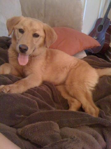 She’s about 4 months old and in great health. Took her to the vet, got her all fixed up with shots, heartguard, flea pills, etc. So far she’s been a great dog. We think she’s probably a lab/golden mix. We’re still tossing around name ideas. My boyfriend wants to name her Lira, but I’m pushing for June.